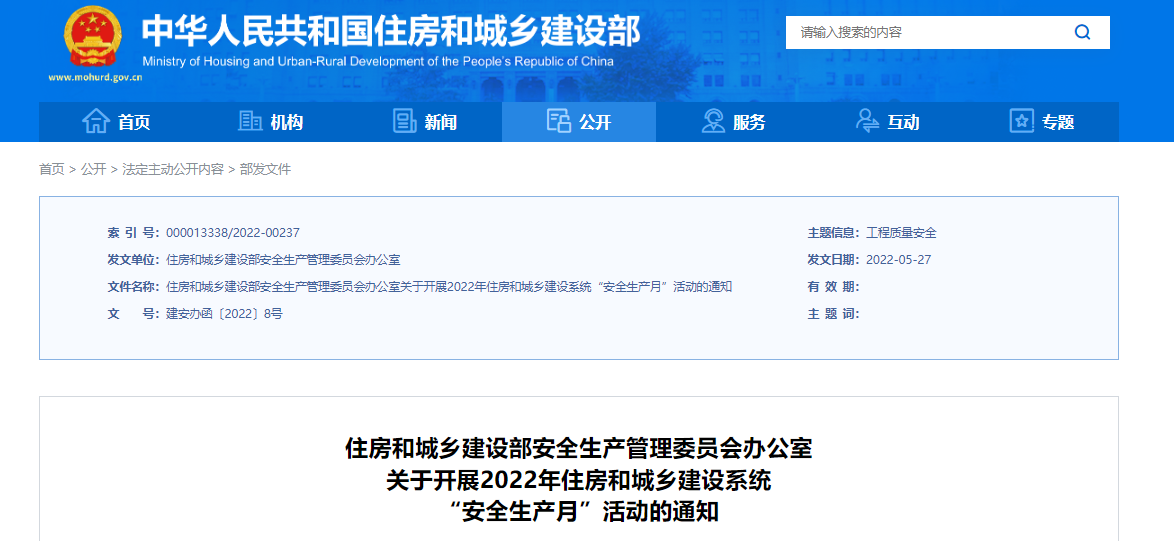 今年6月是第21個(gè)全國(guó)“安全生產(chǎn)月”,主題是“遵守安全生產(chǎn)法 當(dāng)好第一責(zé)任人”。近日,住房和城鄉(xiāng)建設(shè)部安全生產(chǎn)管理委員會(huì)辦公室發(fā)布關(guān)于開展2022年住房和城鄉(xiāng)建設(shè)系統(tǒng)“安全生產(chǎn)月”活動(dòng)的通知。
