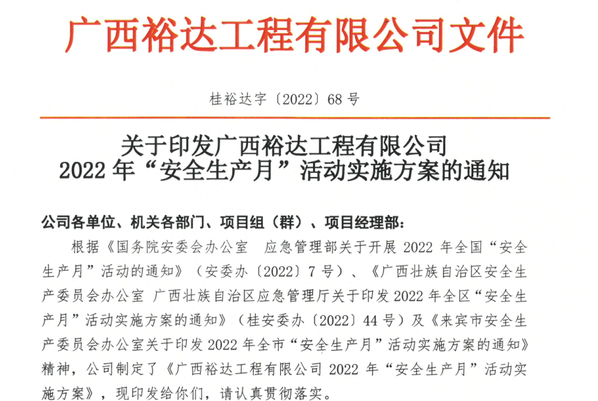 收到通知后公司積極響應(yīng)貫徹落實(shí)并發(fā)布了《關(guān)于印發(fā)廣西裕達(dá)工程有限公司2022年“安全生產(chǎn)月”活動(dòng)實(shí)施方案的通知》要求公司全體人員認(rèn)真深入學(xué)習(xí)貫徹習(xí)近平總書記關(guān)于安全生產(chǎn)重要論述,加強(qiáng)活動(dòng)組織部署。宣傳貫徹安全生產(chǎn)法,強(qiáng)化主體責(zé)任落實(shí)。開展全員安全培訓(xùn),分類強(qiáng)化警示教育。廣泛開展宣傳,營(yíng)造良好安全生產(chǎn)氛圍,以優(yōu)異成績(jī)迎接黨的二十大順利召開。