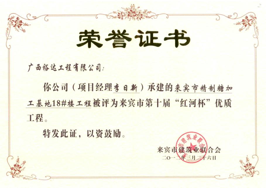 2012年來(lái)賓市第十屆“紅河杯”優(yōu)質(zhì)工程